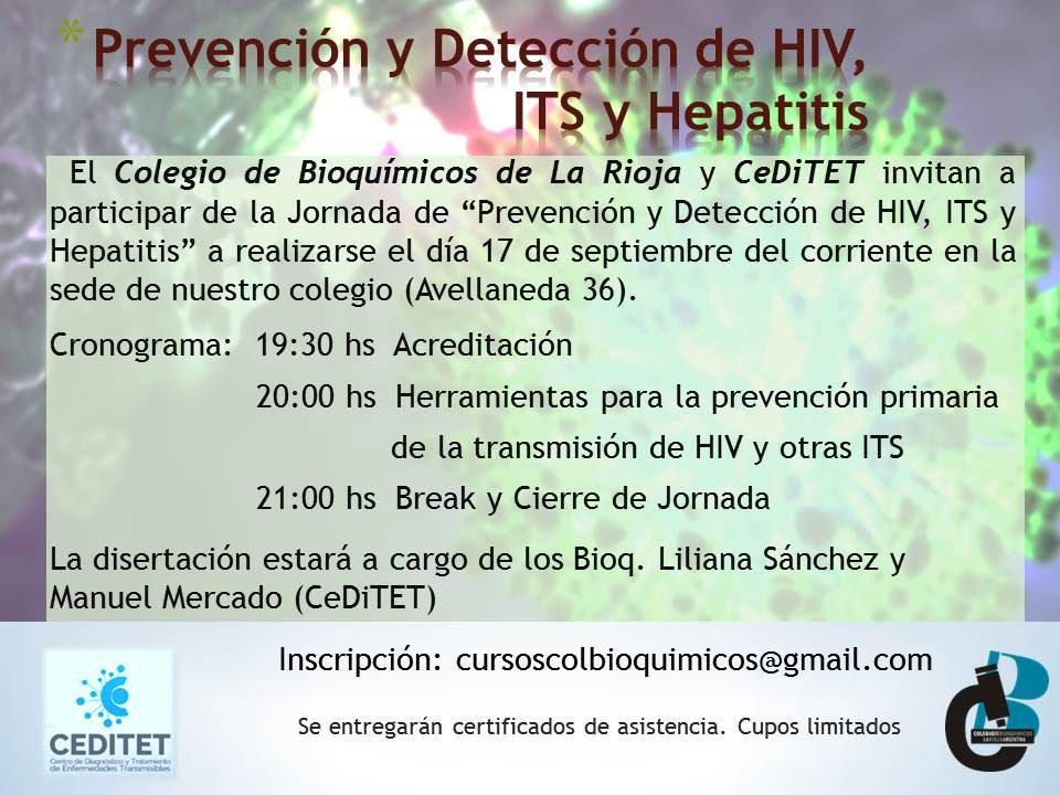 01/09/2018: Jornada de Prevención y Detección de HIV, ITS y Hepatitis, la misma será organizada por el Colegio de Bioquímicos de La Rioja y el Centro de Diagnóstico y Tratamiento de Enfermedades Transmisibles (CeDiTET) con auspicio de la Universidad Nacional de La Rioja. Por inscripciones enviar un mail a cursoscolbioquimicos@gmail.com